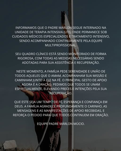 A equipe do padre pediu orações pela recuperação dele e convocou os fiéis para uma corrente de oração. Em comunicado, destacou que “a oração move o Céu”.